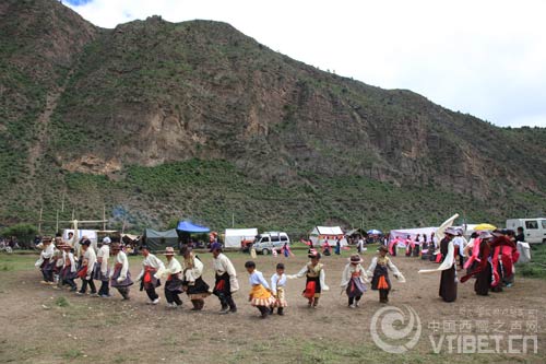 七、八月份的昌都地區(qū),氣候宜人,莊稼黃熟,百花盛開。此時(shí),在婆娑古樹下,在山野花叢中,在如茵草地上,到處都可以見到穿戴鮮艷民族服裝的群眾合家而出,搭上白色的帳篷,跳起歡快的鍋莊,一連數(shù)天野營(yíng)在草壩上,通宵達(dá)旦,狂歡極樂。