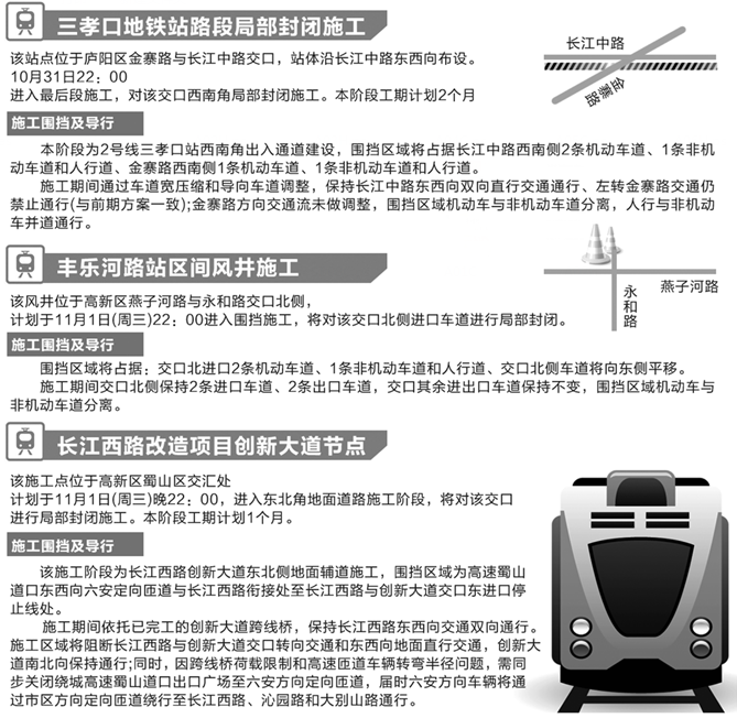 合肥交警部門發(fā)布消息,10月31日22:00起,合肥金寨路與長(zhǎng)江中路交口西南角局部封閉施工;11月1日晚,合肥燕子河路永和路交口北側(cè)、長(zhǎng)江西路改造項(xiàng)目創(chuàng)新大道節(jié)點(diǎn)也將開(kāi)始封閉施工。