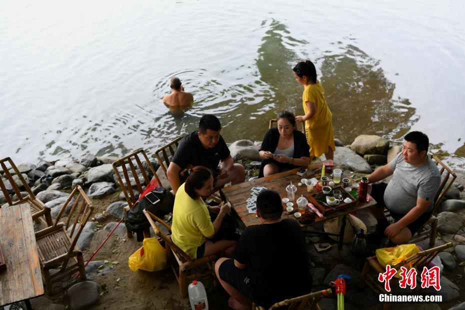 •   游客在溪邊悠閑的打牌娛樂。王東明 攝