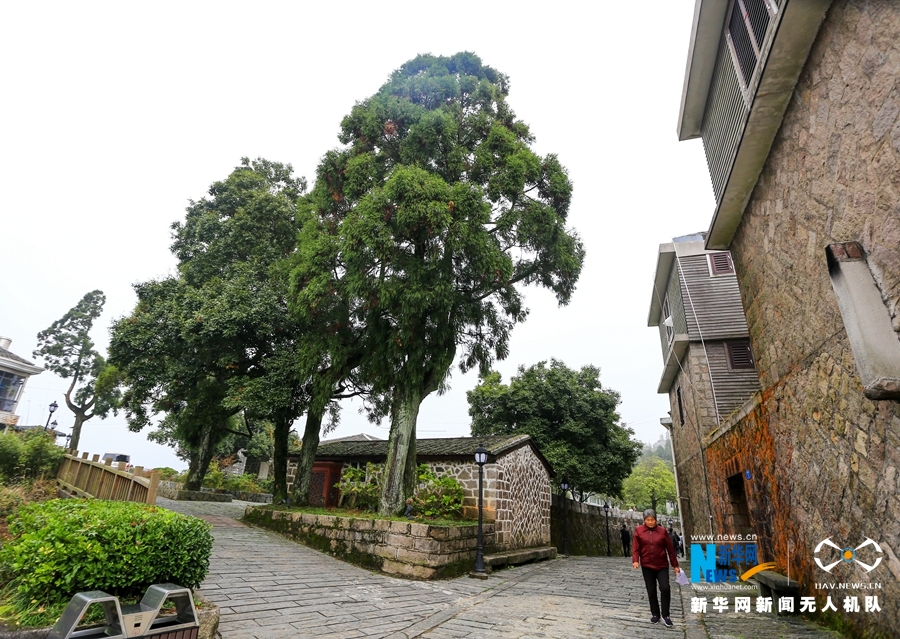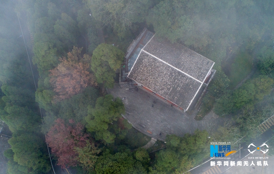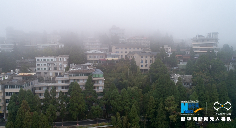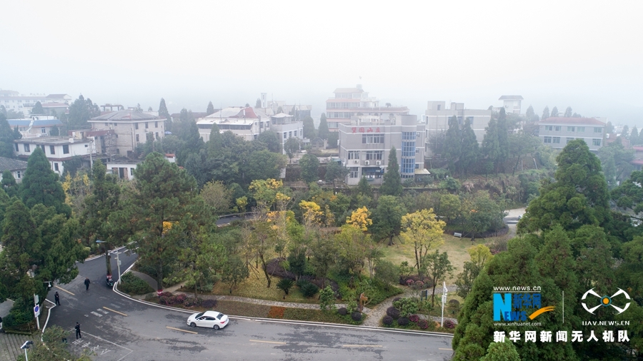 這是在鼓嶺柳杉王公園一帶拍攝到的樹木和民居,遠(yuǎn)處濃霧籠罩(11月6日無人機(jī)拍攝)。新華網(wǎng) 肖和勇 攝