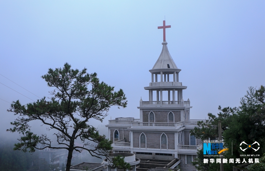 這是大霧中的鼓嶺基督教堂一隅(11月6日攝)。新華網(wǎng) 肖和勇 攝
