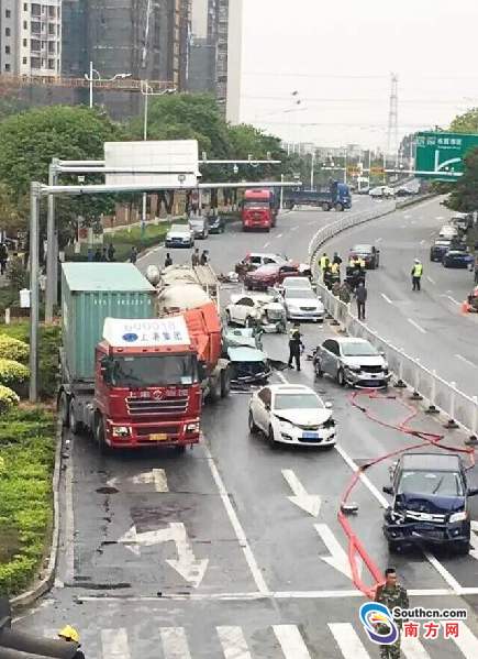 “現(xiàn)場造成2人受傷,包括一名出租車司機(jī),已被送往醫(yī)院治療。攪拌車沖撞速度相當(dāng)快,導(dǎo)致這么多車撞在一起。攪拌車最后撞到前方的一輛集裝箱車、一輛物流貨車上,所以速度才降下來,才避免更多的影響!蔽殛(duì)長說,攪拌車漏了部分潤滑油,我們將路面上的油污清洗干凈。大約一個(gè)小時(shí),現(xiàn)場已基本被清理好。