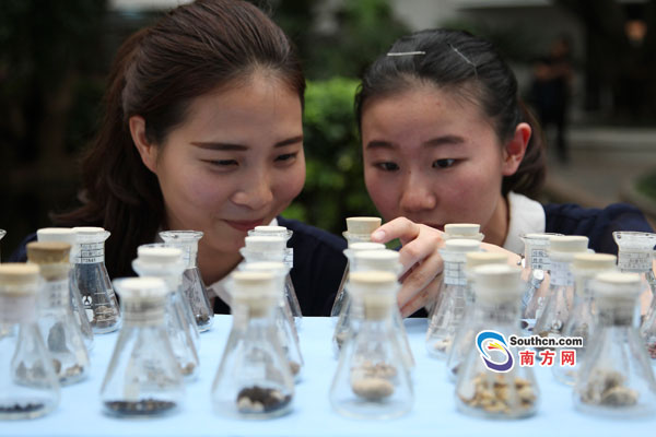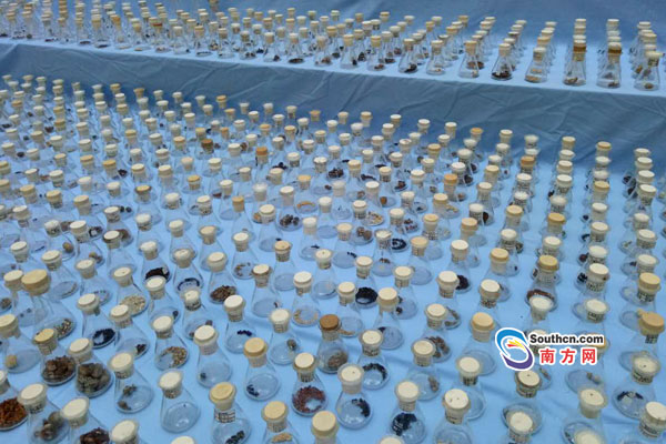 南方網(wǎng)訊 大的像小石子一樣潔白,小的則像高粱一樣紅潤(rùn)光澤,還有像芝麻粉一樣的散碎結(jié)石……近日,在東莞市南城醫(yī)院舉行的學(xué)術(shù)培訓(xùn)班上,南城醫(yī)院副院長(zhǎng)王三貴多年來的“珍藏”——2300多份結(jié)石標(biāo)本擺在會(huì)議現(xiàn)場(chǎng),因?yàn)槲孱伭⑿螤罡鳟,同事將其稱為“五谷雜糧”,也令參觀者嘆為觀止。