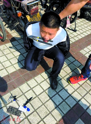 追出500米開外,偷車賊終于跑不動了。4人在一處公交站被人贓俱獲,灰溜溜地蹲成一排。為防止他們逃跑,10名反扒隊員圍成一個圈實行警戒。隨后,“龍四”打電話報警,4名男子被派出所帶走調(diào)查。