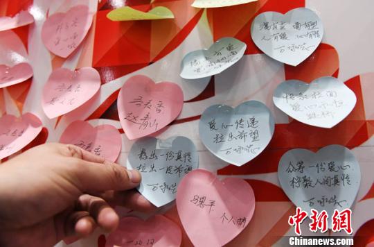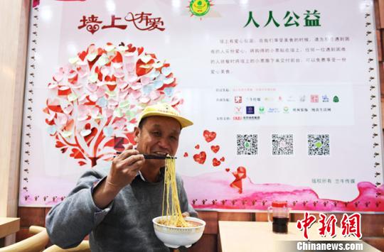 蘭州本地5家牛肉面連鎖品牌加入“墻上有愛,人人公益”愛心牛肉面活動。用餐的人提前購買牛肉面,將購得的小票貼在墻上并寫上祝福語,任何一位需要就餐卻遇到困難的食客,都可以將墻上的小票撕下來交到收銀臺,免費享用牛肉面。圖為活動園地!钇G敏 攝