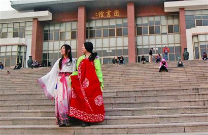 昨天下午,農(nóng)大圖書館前,大學(xué)生們?nèi)宄扇鹤谂_(tái)階上看書,中間兩個(gè)穿著漢服的女孩特別引人注目!敖(jīng)常看到她們這樣穿!薄白餍惆!”“在排練情景劇?”學(xué)生們對(duì)此似乎見怪不怪,但都說不出她們到底在干什么。說話間,兩名“漢服女孩”起身,一路聊一路走著,校園林蔭道、教室里、小河邊,兩人的出現(xiàn)成了一道獨(dú)特的風(fēng)景,每到一處立馬引來同學(xué)們的目光。