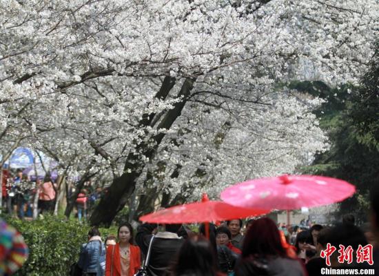 陽春三月,武漢春意濃,游客在武漢大學(xué)校園內(nèi)觀賞綻放的櫻花。(資料圖)