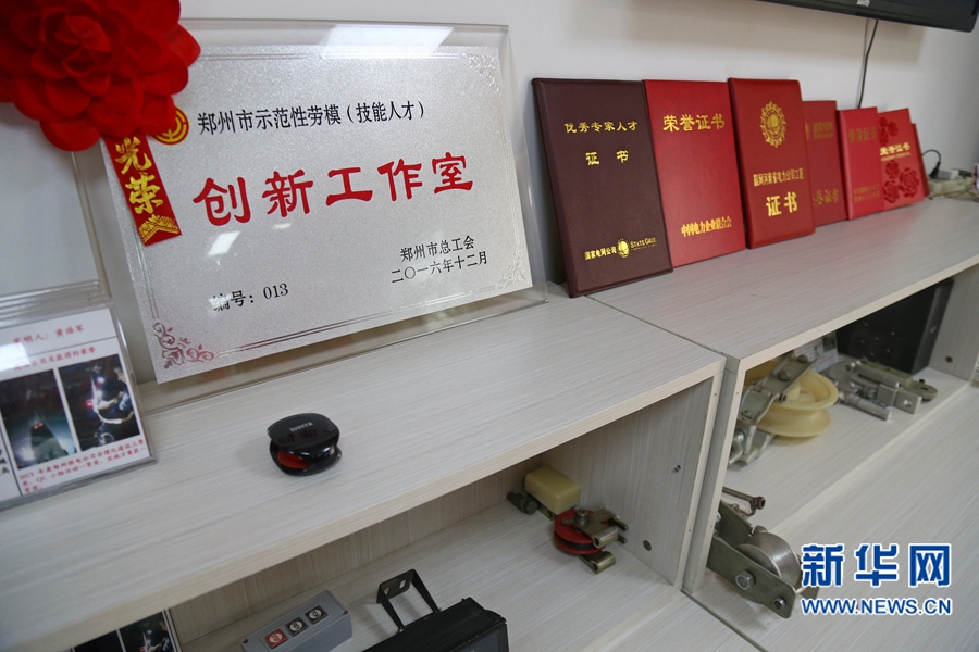 在國網(wǎng)鄭州供電公司輸電運檢室黃浩軍工作室里,自封口式軟梯支架、復(fù)合絕緣子帶電更換支架、等電位防人身墜落保護裝置、導(dǎo)地線牽引繩拉力實時無線檢測儀、安全防護網(wǎng)承力繩實時張力檢測、導(dǎo)地線LED夜間弧垂激光觀測儀等整齊排列,也見證著一位“電力工匠”的創(chuàng)新歷程。