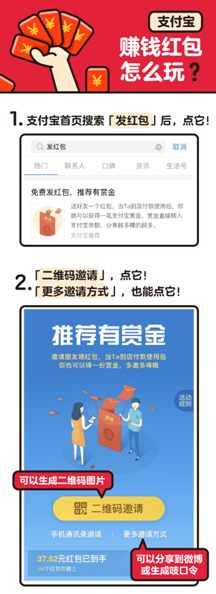 支付寶方面介紹,賺錢(qián)紅包沒(méi)有任何門(mén)檻,任何用戶都可以在支付寶首頁(yè)搜索“發(fā)紅包”,進(jìn)入“免費(fèi)發(fā)紅包,推薦有賞金”的頁(yè)面,將紅包通過(guò)吱口令、二維碼等方式分享給其他人。申請(qǐng)了收錢(qián)碼的小商家,也可以在支付寶“商家服務(wù)”功能中免費(fèi)領(lǐng)取紅包碼海報(bào),張貼在自己的門(mén)店。