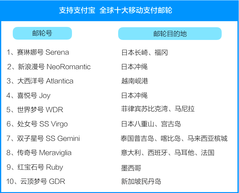 不僅是陸地商圈,支付寶表示,今年春節(jié),「海上目的地」也首次成規(guī)模接入移動支付:包括日本沖繩、馬來西亞沙巴等在內(nèi)的十大海島成為首批接入移動支付的海島,而中國母港出發(fā)的所有郵輪,目前也都已接入移動支付,以方便游客的手機出游。