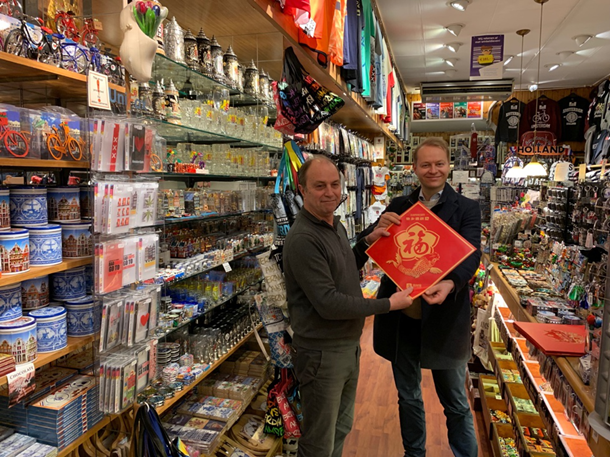 荷蘭阿姆斯特丹一家紀念品店內(nèi)老板展示“福”字推薦中國游客“掃!。