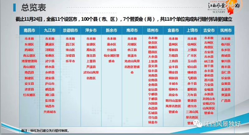 一年來,省政府及省文化和旅游廳等部門高度重視條例貫徹落實(shí)工作,先后成立了宣傳貫徹工作領(lǐng)導(dǎo)小組,及時(shí)下發(fā)了《宣傳貫徹〈江西省旅游者權(quán)益保護(hù)條例〉實(shí)施方案》,組織出版了《江西省旅游者權(quán)益保護(hù)條例釋義》,開展了“百萬網(wǎng)民學(xué)法律”江西省旅游者權(quán)益保護(hù)條例專場(chǎng)知識(shí)競(jìng)賽活動(dòng),近32萬人次參與網(wǎng)絡(luò)答題,形成了較好的宣傳輿論氛圍。同時(shí),各地對(duì)條例中先行賠付等重點(diǎn)創(chuàng)新條款進(jìn)行了及時(shí)落實(shí),如上饒市設(shè)立了總額1000萬元優(yōu)質(zhì)旅游誠(chéng)信理賠基金,鷹潭市在全省率先升格組建了副縣級(jí)旅游綜合執(zhí)法支隊(duì)等。截止11月24日,我省11個(gè)設(shè)區(qū)市本級(jí)、100個(gè)縣(市、區(qū))、7個(gè)管委會(huì)(局)全部建立了先行賠付制度(見圖一)。其中,7月-11月的每月建立比例逐月攀升(見圖二)。