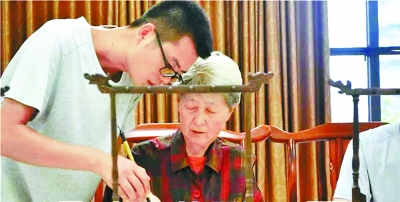 楊云海是住在這間養(yǎng)老院的一位志愿者。他是一位國畫老師,開了藝術(shù)工作室,還寫得一手好書法。本來就愛去老年大學(xué)做志愿者的他,住進(jìn)養(yǎng)老院后更怡然自得了——一到周六下午老人們就巴巴地盼著楊老師來4號樓上課,老人們總會準(zhǔn)點(diǎn)坐在教室里,屋子里飄散著好聞的油墨味。楊云海給每人發(fā)了米字格的皮紙和毛筆,這些都是養(yǎng)老院出錢買的。楊云海喜歡幫著老人慢悠悠地寫寫畫畫,寫得好的,楊云海會表揚(yáng);寫得不好的,他也毫不客氣地指出——“李爺爺,你寫的字粗細(xì)不一致,沒豎在中線上哦!薄皩W(xué)生”們上交的作業(yè)上沒有寫名字,但“楊老師”都一一記得。