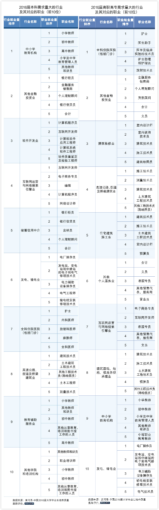 記者根據(jù)調(diào)查數(shù)據(jù)了解到,在對本科和高職高專畢業(yè)生需求量最大的前十個行業(yè)中,有六個行業(yè)是重合的,包括:“中小學教育機構(gòu)”“其他金融投資業(yè)”“互聯(lián)網(wǎng)運營與網(wǎng)絡(luò)搜索引擎業(yè)”“發(fā)電、輸電業(yè)”“全科住院醫(yī)院(包括門診)”“高速公路、街道及橋梁建筑業(yè)”?梢姼呗毟邔:捅究菩枨罅枯^大的行業(yè)存在一定的一致性。