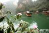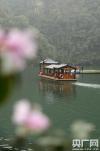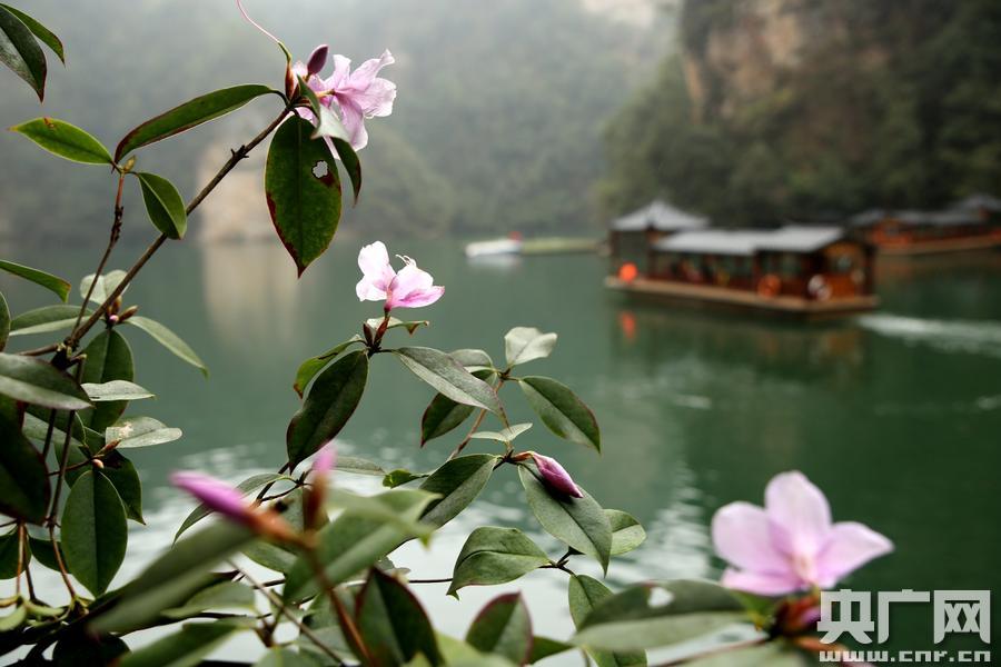 )立春后,湖南張家界寶峰湖風景區(qū)櫻花、映山紅次第開放,爭奇斗艷,與碧綠的湖水交相輝映,船行其間宛如一幅春色畫卷