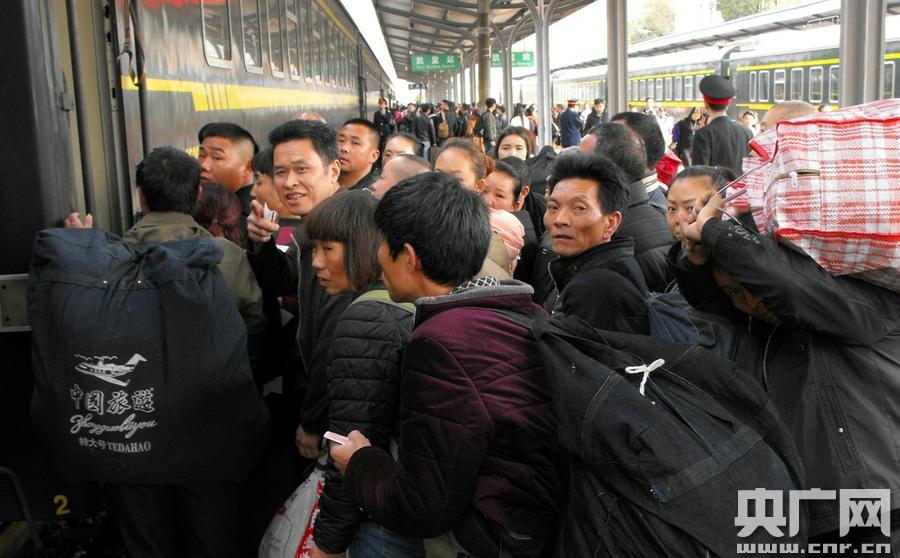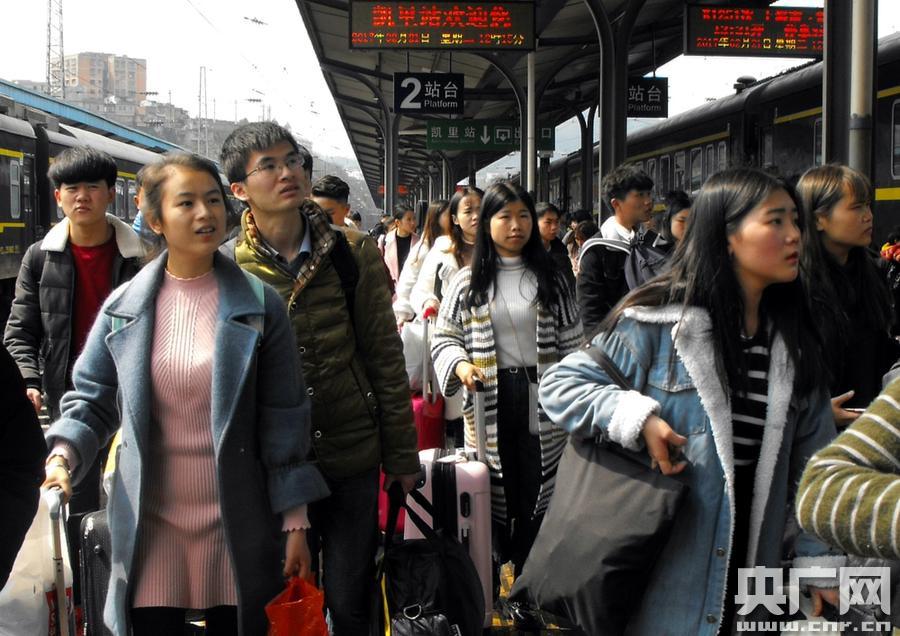 2月22日,凱里火車站外出務(wù)工旅客在排隊上車中。(央廣網(wǎng)發(fā) 姜澤鵬攝) 央廣網(wǎng)黔東南苗族侗族自治州2月22日消息(記者陳屹 通訊員姜澤鵬)2月22日,春運結(jié)束后第一天,成都鐵路局凱里火車站迎來務(wù)工流和學生流高峰。 客流方向主要往上海、北京、廣州、重慶、福建等。春運結(jié)束,服務(wù)不減,貴州鐵路嚴把實名制驗證驗票和“三品”檢查關(guān)口,對進站口、檢票口、站臺、天橋、地道、電梯、樓梯等重點部位加強盯控,做好客流引導和旅客服務(wù)工作。