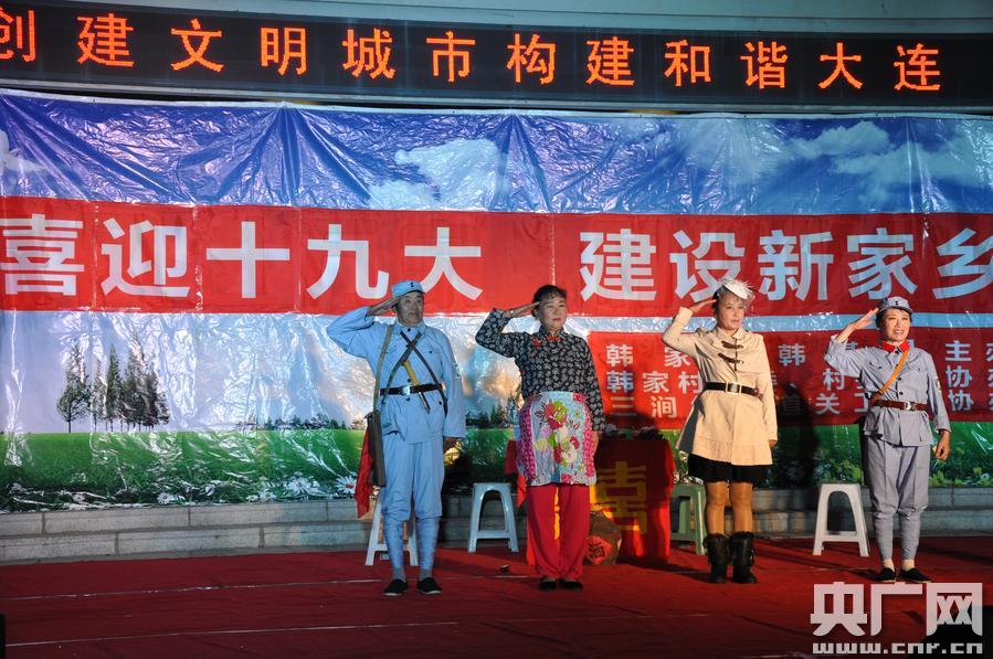 大連:78歲韓基昌老漢辦晚會喜迎十九大 央廣網(wǎng)大連9月19日消息(記者張四清 通訊員 劉煥恩 李忠衛(wèi))9月17日晚17時,舞蹈、表演唱、快板、獨唱、紅色小劇、小品……20個不同類型的文化節(jié)目、100多名文化志愿者,在大連市旅順口區(qū)三澗堡街道韓家村舉辦了“喜迎十九大,建設(shè)新家鄉(xiāng)”文藝晚會。這臺精彩熱鬧的文藝演出,從節(jié)目編排到導演策劃,從背景制作到歌舞選撥,都是韓家村78歲的韓基昌老漢一手操辦的。 韓基昌是三澗堡街道韓家村一位普通農(nóng)民。今年“五一”剛過,韓基昌生出個大膽的想法——在家門口辦一場文藝晚會喜迎十九大召開。消息一傳出,三澗堡街道關(guān)工委積極組織8個村100多名文化志愿者參加助演,并協(xié)調(diào)、音響、燈光等演出設(shè)備,他所在們韓家村黨委、村關(guān)工委派出專人幫助選擇演出場地、接電,協(xié)調(diào)三澗堡派出所負責安全保衛(wèi)工作等。 在演出現(xiàn)場,韓基昌告訴記者,這臺晚會以唱紅歌、跳紅舞、演紅劇為主要內(nèi)容,放聲歌唱共產(chǎn)黨,黨的恩情永不忘,以此表達農(nóng)民對中國共產(chǎn)黨、對偉大祖國的熱愛。 為辦好這臺晚會,他成立了“晚會籌辦”小組,大女兒韓曉艷、二女兒韓曉杰得知父親想法后,全力支持父親工作。不僅擔當起“籌辦”小組成員,而且當起獨唱、舞蹈演員。老韓還專門編寫了快板《普法教育就是好》,把法律條文用文藝形式來宣傳,使居民看了節(jié)目又受到教育。 據(jù)了解,20多年來,韓基昌帶著歡樂走四方,帶著正能量深入村屯、社區(qū)、部隊、敬老院等地,自編自導文藝節(jié)目125個,義務(wù)演出300多場,觀眾達15萬多人次,豐富了農(nóng)村文化生活的大舞臺。