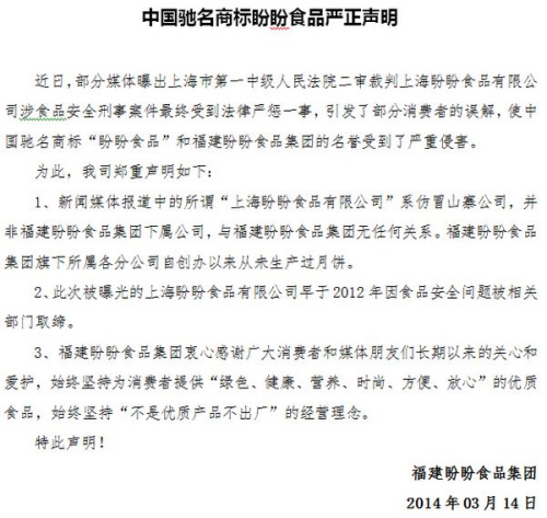 福建盼盼食品發(fā)聲明:上海盼盼食品系仿冒山寨公司