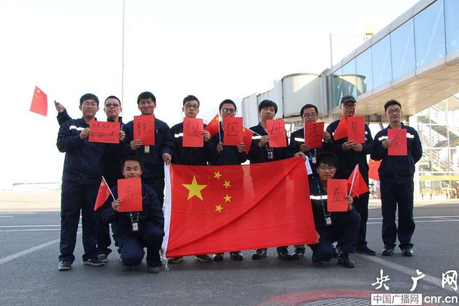 一整天的揮汗如雨,小伙子們順利完成了全部定檢任務(wù),在工作結(jié)束后,大家拿著寫滿祝福的紅紙站在國(guó)旗下合影留念!皣(guó)慶節(jié)到了,我們會(huì)認(rèn)真做好每一架飛機(jī)客艙的檢查和維修,用最棒的客艙環(huán)境迎接旅客,用出色工作業(yè)績(jī)?yōu)樽鎳?guó)獻(xiàn)禮!”車間團(tuán)支部書記陳峰自信地說(shuō)。