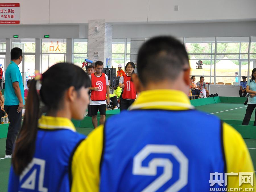 第十屆全國少數(shù)民族傳統(tǒng)體育運(yùn)動會蹴球賽場上正在比賽的一組對手(央廣網(wǎng)記者 金建軍 攝)
