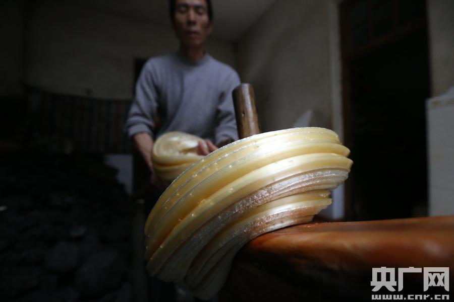 情人節(jié)的頭一天,晉寧縣晉城鎮(zhèn)回龍村丁少明家里,上百斤糙米已經(jīng)淘洗干凈。丁少明一桶一桶抄起倒進(jìn)蒸籠,妻子則站在齊腰深的灶堂坑道里,鏟起一鏟子煤炭送進(jìn)灶爐;饎轁u旺,直徑四尺二的鐵鍋開始往上蒸發(fā)騰騰熱氣。米飯蒸熟后,要加入麥芽糖自然發(fā)酵。經(jīng)過一段時間發(fā)酵,等米飯滲出糖水,再將糖水加熱,蒸發(fā)掉多余的水分,便成了色澤金黃的晴糖。當(dāng)晴糖冷卻至溫?zé)、柔軟程度剛好時,將其盤在木樁上不斷拉伸,重疊,再拉伸,再重疊,如此反復(fù)數(shù)次,晴糖內(nèi)充滿氣泡,色澤也從金黃變成米白。