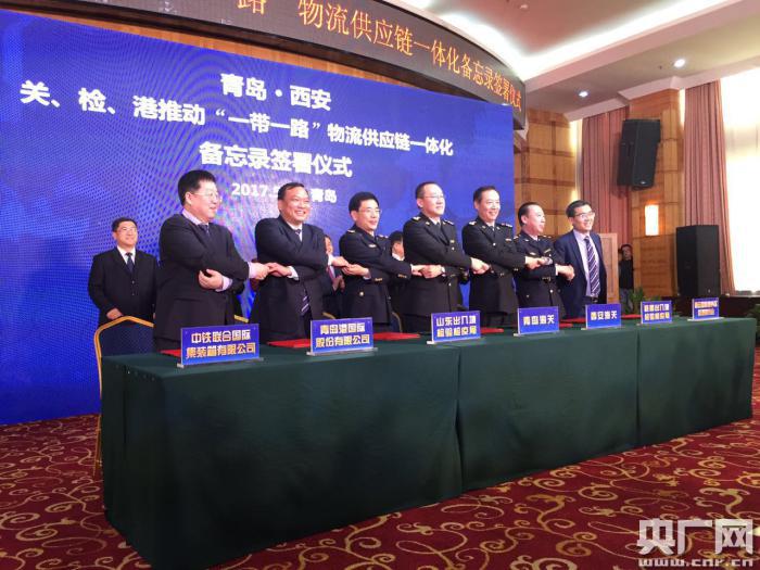青島海關(guān)、西安海關(guān),山東出入境檢驗(yàn)檢疫局、陜西出入境檢驗(yàn)檢疫局,青島港、西安國際港務(wù)區(qū)及中鐵聯(lián)合國際集裝箱有限公司七方共同簽署推動(dòng)“一帶一路”區(qū)域物流供應(yīng)鏈一體化倡議。提出要推動(dòng)實(shí)現(xiàn)海鐵聯(lián)運(yùn)、海陸聯(lián)運(yùn)、空鐵聯(lián)運(yùn)等多種運(yùn)輸方式無縫銜接和資源共享。圍繞國際物流供應(yīng)鏈,打造一體化物流服務(wù)平臺(tái),整合信息數(shù)據(jù)資源,建立“業(yè)務(wù)協(xié)同、信息共享”的物流服務(wù)機(jī)制,培育發(fā)展服務(wù)“一帶一路”的大型物流企業(yè)集團(tuán),提升現(xiàn)代物流業(yè)服務(wù)能力和水平。