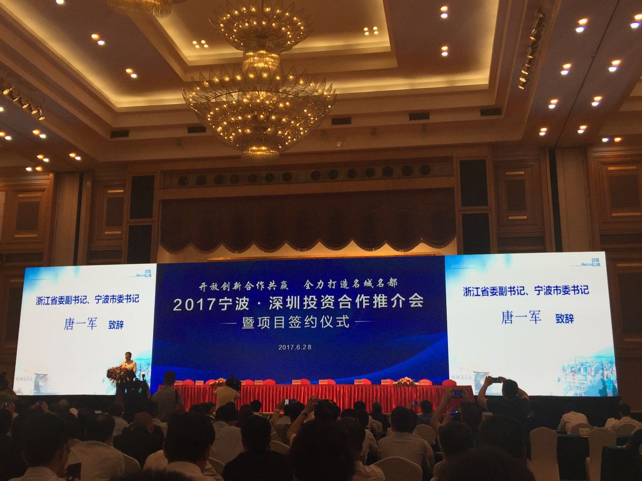 深圳市副市長陳彪、市委副秘書長林揚到會。浙江省委副書記、寧波市委書記唐一軍,寧波市委副書記、市長裘東耀、市人大常委會主任余紅藝、市政協(xié)主席楊戍標(biāo)以及寧波市政府部門和區(qū)縣(市)負責(zé)人,企業(yè)代表約300余人參加了會議。