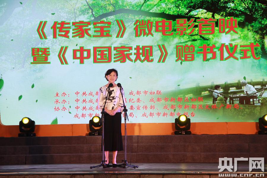 《傳家寶》微電影首映暨《中國家規(guī)》贈書儀式在蓉舉行(央廣網(wǎng)記者 韓民權(quán) 攝) 央廣網(wǎng)成都7月20日消息(記者韓民權(quán))7月20日,由中共成都市紀委、成都市婦聯(lián)主辦,中共成都市新都區(qū)紀委、新都區(qū)婦聯(lián)等共同承辦的《傳家寶》微電影首映暨《中國家規(guī)》贈書儀式在成都市新都區(qū)舉行。參加此次活動的人員有鎮(zhèn)(街)、部門機關(guān)代表、“最美家庭”代表、群眾代表共計500余人。 好家風(fēng)是黨員領(lǐng)導(dǎo)干部拒腐防變的一道前沿防線,為進一步發(fā)揮家庭成員在家庭助廉工作中的特殊作用,扎實推進黨風(fēng)廉政建設(shè)和反腐敗工作,成都市紀委和成都市婦聯(lián)圍繞家風(fēng)家訓(xùn)主題,聯(lián)合打造廉政文化產(chǎn)品《傳家寶》微電影。每一個家庭都應(yīng)該建設(shè)好自己的家風(fēng),傳承好精神上的“傳家寶”,全市廣大家庭將繼續(xù)大力弘揚優(yōu)良家風(fēng),以千千萬萬家庭的好家風(fēng)、好家規(guī)支撐起全社會的好風(fēng)氣,為提升全市全面從嚴治黨工作成效貢獻力量。 在開展的贈書儀式中,成都市紀委、市婦聯(lián)領(lǐng)導(dǎo)現(xiàn)場向領(lǐng)導(dǎo)干部代表贈送了由中央紀委監(jiān)察網(wǎng)站匯編的《中國家規(guī)》一書!吨袊乙(guī)》匯集了中國50個古今名人家規(guī)故事,立足于弘揚中華優(yōu)秀文化,注重思想性、知識性、文化性、服務(wù)性,講述家規(guī)故事,展現(xiàn)家國情懷。贈書活動旨在讓受贈者從中汲取規(guī)矩意識、紀律意識,力求更好地發(fā)揮家訓(xùn)家規(guī)文化的教化作用,促進樹立良好家風(fēng)。 同時,本次活動緊扣當前黨風(fēng)廉政建設(shè)和家風(fēng)建設(shè)主題,以本土藝術(shù)家創(chuàng)作的舞蹈《荷頌》、詩歌《五百年的等待》、川劇《拾玉鐲》等弘揚家風(fēng)家訓(xùn)、崇廉尚實的文藝節(jié)目,把本土特色文化融入到文體娛樂活動中,贏得了現(xiàn)場觀眾的陣陣喝彩,進一步弘揚優(yōu)秀傳統(tǒng)文化,傳播了清正廉潔正能量。 據(jù)悉,近年來,成都市婦聯(lián)通過大力推進蓉城女性創(chuàng)優(yōu)創(chuàng)美行動,充分發(fā)揮婦女在傳承良好家風(fēng),弘揚家庭美德中的獨特作用推進廉潔文化進家庭,開展、“傳家風(fēng)、立家規(guī)、樹新風(fēng)”系列主題活動,突出以家風(fēng)帶民風(fēng)、促政風(fēng)、樹新風(fēng),推動了黨風(fēng)政風(fēng)社風(fēng)向善向上。 -