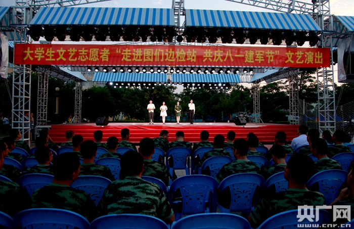 央廣網(wǎng)圖們8月1日消息(記者晁向榮 通訊員張彪)7月31日晚,大學(xué)生文藝志愿者“走進(jìn)圖們邊檢站 共慶八一建軍節(jié)”文藝演出在吉林省圖們市的圖們江廣場(chǎng)隆重舉行。來(lái)自甘肅中醫(yī)藥大學(xué)、大連理工大學(xué)以及西安建筑科技大學(xué)的30名大學(xué)生文藝志愿者為官兵們奉上一場(chǎng)精彩的演出,圖們邊檢站、延邊邊防支隊(duì)機(jī)動(dòng)大隊(duì)二中隊(duì)官兵及駐地群眾共計(jì)500余人觀看演出。