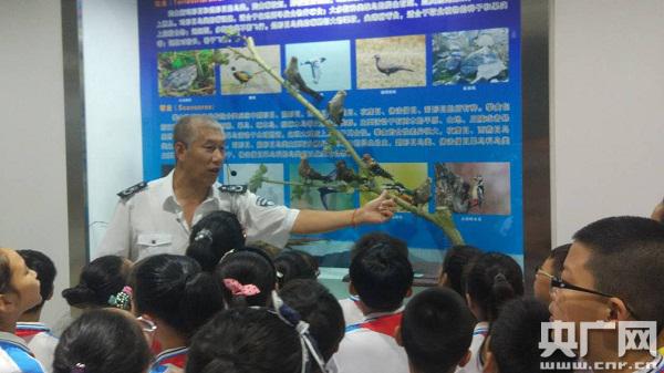 保護區(qū)管理局科研人員為參觀蛇島老鐵山自然博物館的小學生做講解。