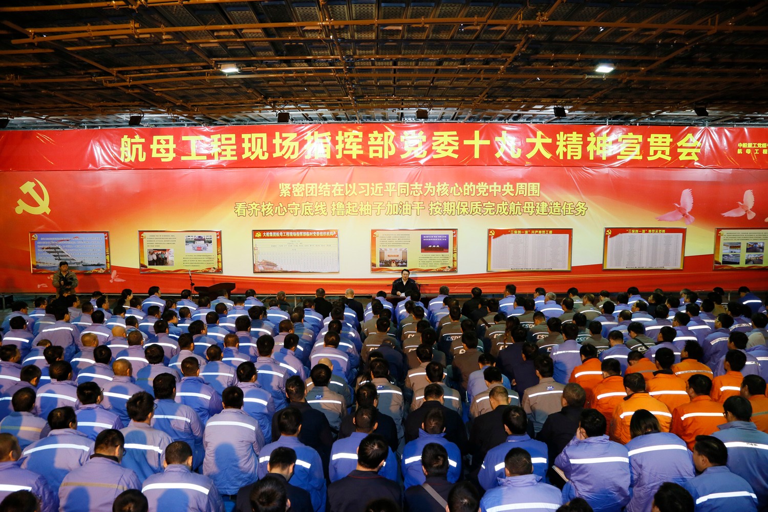 航母工程現(xiàn)場指揮部黨委是在航母建造中堅持和加強(qiáng)基層黨建、發(fā)揮黨組織領(lǐng)導(dǎo)作用的一個實踐創(chuàng)新。航母工程現(xiàn)場指揮部黨委認(rèn)為,航母工程全線必須認(rèn)真學(xué)習(xí)領(lǐng)會黨的十九大報告和黨章,把黨的十九大精神學(xué)懂弄通做實,堅持戰(zhàn)斗力標(biāo)準(zhǔn),向能打仗,打勝仗聚焦,推動實現(xiàn)質(zhì)量變革、效率變革、動力變革,以更加高昂的斗志和更加自覺的行動,踐行習(xí)近平新時代中國特色社會主義思想和習(xí)近平強(qiáng)軍思想。航母工程建設(shè)要適應(yīng)“強(qiáng)起來”的新時代要求,實現(xiàn)從“用起來”、“造起來”到“強(qiáng)起來”的跨越,把首艘國產(chǎn)航母打造成有效履行新時代強(qiáng)軍強(qiáng)國歷史史命的大國重器。