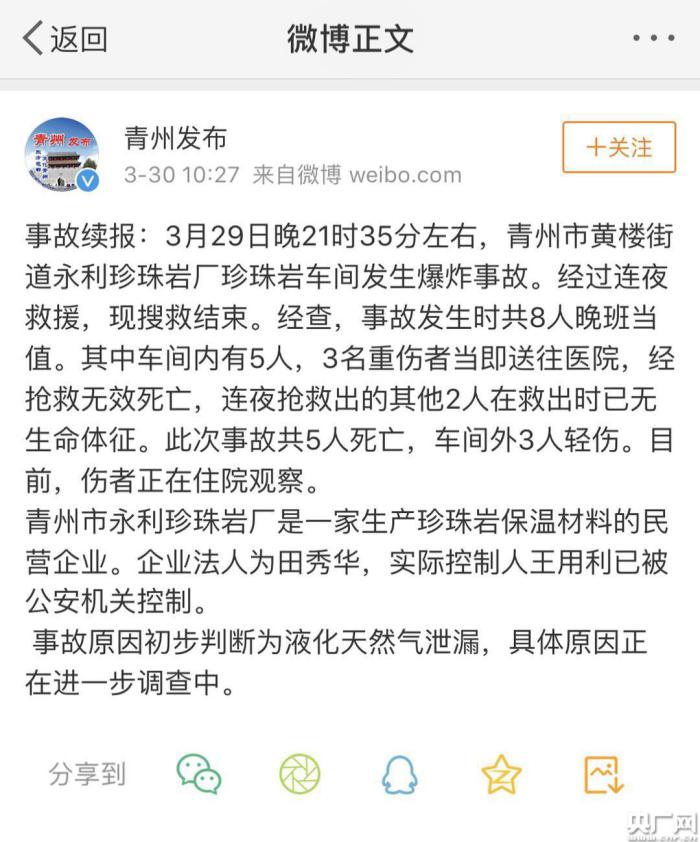 央廣網(wǎng)濰坊3月30日消息(記者劉?)記者從山東省青州市政府新聞辦官方微博@青州發(fā)布了解到,3月29日晚21時35分左右,青州市黃樓街道永利珍珠巖廠珍珠巖車間發(fā)生爆炸事故。經(jīng)過連夜救援,現(xiàn)搜救結束。經(jīng)查,事故發(fā)生時共8人晚班當值。其中車間內(nèi)有5人,3名重傷者當即送往醫(yī)院,經(jīng)搶救無效死亡,連夜搶救出的其他2人在救出時已無生命體征。此次事故共5人死亡,車間外3人輕傷。目前,傷者正在住院觀察。