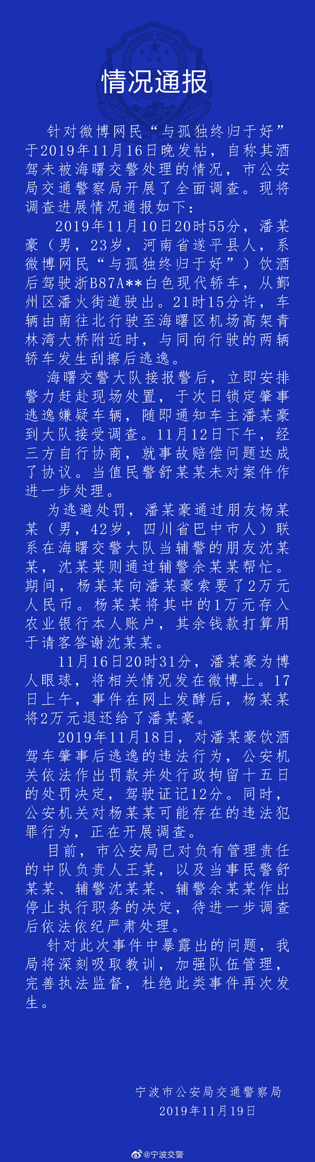 通報(bào)中說(shuō),2019年11月10日20時(shí)55分,潘某豪(男,23歲,河南省遂平縣人,系微博網(wǎng)民“與孤獨(dú)終歸于好”)飲酒后駕駛浙B87A**白色現(xiàn)代轎車,從寧波市鄞州區(qū)潘火街道駛出。21時(shí)15分許,車輛由南往北行駛至海曙區(qū)機(jī)場(chǎng)高架青林灣大橋附近時(shí),與同向行駛的兩輛轎車發(fā)生刮擦后逃逸。海曙交警大隊(duì)接報(bào)警后,立即安排警力趕赴現(xiàn)場(chǎng)處置,于次日鎖定肇事逃逸嫌疑車輛,隨即通知車主潘某豪到大隊(duì)接受調(diào)查。11月12日下午,經(jīng)三方自行協(xié)商,就事故賠償問(wèn)題達(dá)成了協(xié)議。當(dāng)值民警舒某某未對(duì)案件作進(jìn)一步處理。為逃避處罰,潘某豪通過(guò)朋友楊某某(男,42歲,四川省巴中市人)聯(lián)系在海曙交警大隊(duì)當(dāng)輔警的朋友沈某某,沈某某則通過(guò)輔警余某某幫忙。期間,楊某某向潘某豪索要了2萬(wàn)元人民幣。楊某某將其中的1萬(wàn)元存入農(nóng)業(yè)銀行本人賬戶,其余錢款打算用于請(qǐng)客答謝沈某某。11月16日20時(shí)31分,潘某豪為博人眼球,將相關(guān)情況發(fā)在微博上。11月17日上午,事件在網(wǎng)上發(fā)酵后,楊某某將2萬(wàn)元退還給了潘某豪。