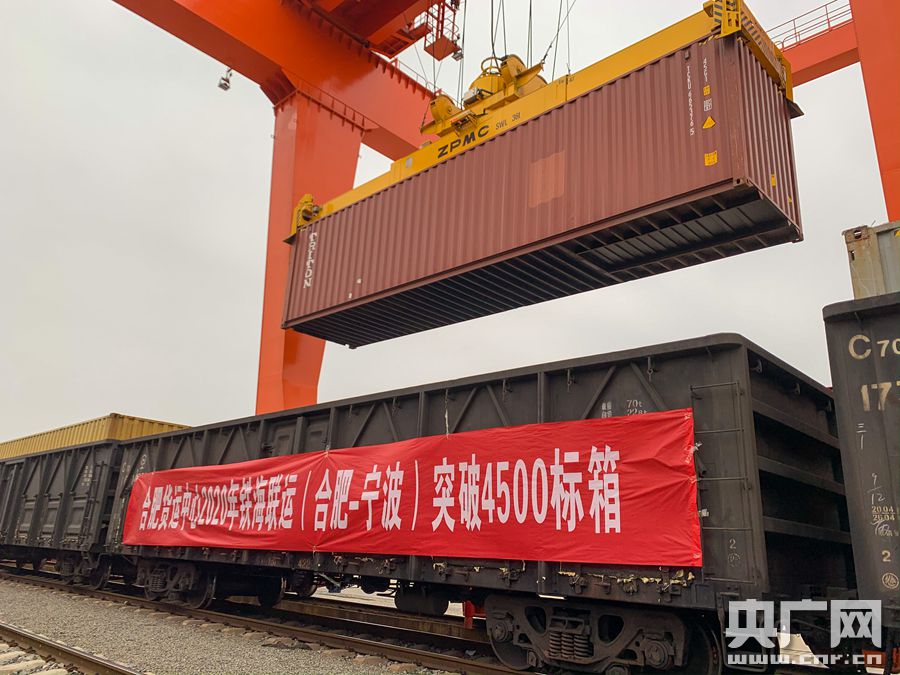 合肥貨運(yùn)中心2020年鐵海聯(lián)運(yùn)(合肥-寧波)第4500標(biāo)準(zhǔn)箱裝車(chē)(央廣網(wǎng)發(fā) 通訊員供圖)