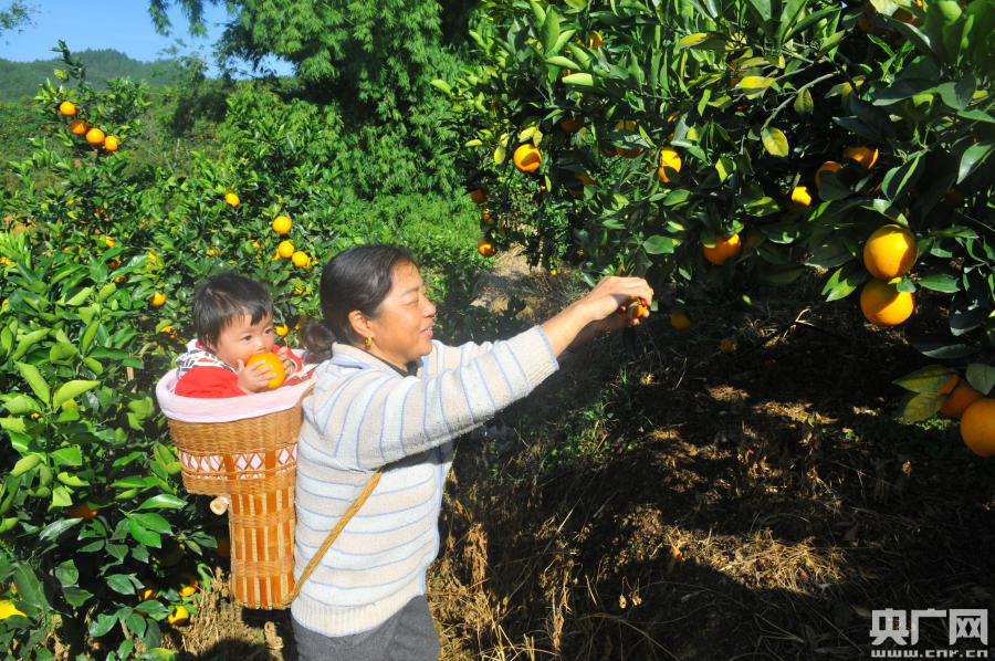 在江西省贛州市全南縣南逕鎮(zhèn)三峽移民新村蔡祖富的臍橙園,一家三口人高興地開(kāi)始采摘臍橙(央廣網(wǎng)發(fā) 通訊員供圖)