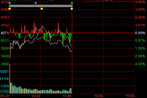 截至午盤(pán),滬指報(bào)3971.53點(diǎn),下跌99.37點(diǎn),跌幅2.44%,成交3571億元;深成指報(bào)13281.36點(diǎn),下跌237.15點(diǎn),跌幅1.75%,成交3452億元;創(chuàng)業(yè)板指報(bào)2843.83點(diǎn),下跌53.99點(diǎn),跌幅1.86%,成交926.9億元。