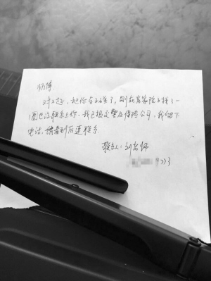 一個朋友注意到,遠(yuǎn)處十幾米遠(yuǎn)的地方有一個攝像頭。吳先生氣憤地說,“擦掛了車子,司機還跑了,太氣人,走,去看監(jiān)控,非得要把肇事的車子找出來不可!本驮趨窍壬团笥褱(zhǔn)備去看監(jiān)控時,劇情反轉(zhuǎn)了——他的另一名朋友發(fā)現(xiàn),吳先生的車窗上貼著一張字條。吳先生拿起來一看,是肇事司機寫的,上面寫著:師傅,對不起,把你車子碰了,剛在肖家院子找了一圈,也沒有聯(lián)系上你,我已報交警及保險公司,我留下電話,請看到后速聯(lián)系。聯(lián)系人,劉老師,電話…….