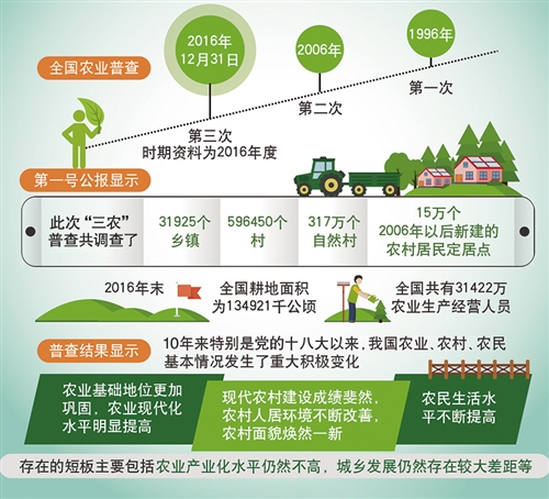 自2015年6月份起,國務院決定開展第三次全國農(nóng)業(yè)普查。此次普查的標準時點為2016年12月31日,時期資料為2016年度,共調(diào)查了31925個鄉(xiāng)鎮(zhèn),其中鄉(xiāng)11081個,鎮(zhèn)20844個;596450個村,其中556264個村委會,40186個涉農(nóng)居委會;317萬個自然村;15萬個2006年以后新建的農(nóng)村居民定居點。