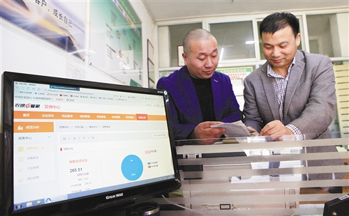 農(nóng)行員工走訪河北省寧晉縣玉峰糧油經(jīng)銷處,與負(fù)責(zé)人交流農(nóng)銀“e管家”使用情況。 新華社記者 王 曉攝