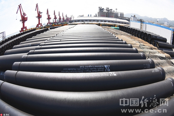 圖片說(shuō)明:2018年5月31日,一批中國(guó)制造的鑄管在江蘇連云港港口碼頭集港,等待裝船出口。(圖片來(lái)源:耿玉和/東方IC)
