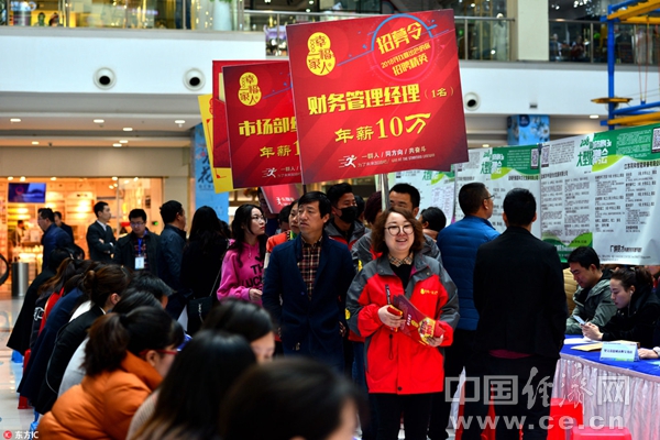 圖片說(shuō)明:2018年3月31日,一家用人單位在江蘇鹽城第43屆促進(jìn)青年就業(yè)創(chuàng)業(yè)招聘現(xiàn)場(chǎng)舉牌宣傳。(圖片來(lái)源:蔣曉鵬/東方IC)
