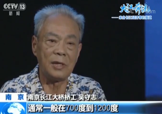 南京長江大橋橋工 吳守志:燒釘,加溫以后,通常一般在700度到1200度,我就記得我們最長的工作時(shí)間,是早上七點(diǎn),一直鉚合到晚上將近八點(diǎn)。