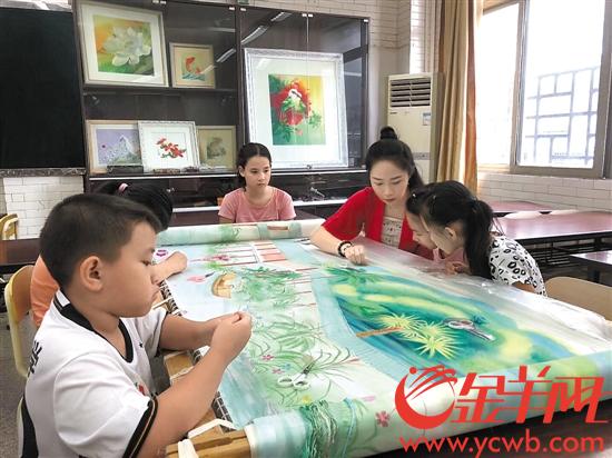 在廣州市荔灣少年宮,一群10歲左右的學(xué)生和一位20來歲的女孩正圍坐在一幅自然山水繡布前,女孩兩手時而靈活地穿針引線,時而放下針線,摸摸孩子們的小腦袋,抓起孩子們的小胖手,細(xì)心細(xì)語地說:“平常我們都用‘直紋直針’繡,如果要繡水紋,就要用‘稀疏針’了,直的地方保持平衡,波浪的地方就要打斜一點點……”