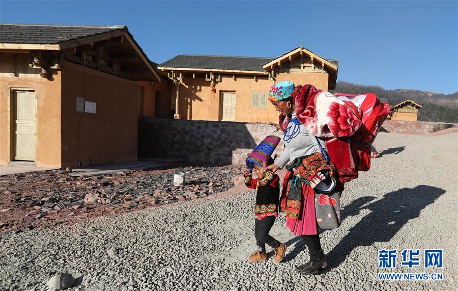在昭覺(jué)縣三河村易地扶貧安置點(diǎn),馬海阿依帶著女兒搬進(jìn)新居(2月11日攝)。2月11日,三河村首批29戶(hù)、168人告別居住多年的土坯房,搬入易地扶貧安置點(diǎn)的新家。新華社記者 江宏景 攝