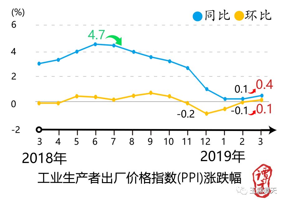 看看3月份的工業(yè)品價格(就是所謂的工業(yè)生產者出廠價格指數(shù)),這個指數(shù)同比上漲0.4%,環(huán)比漲了0.1%,說明工業(yè)領域的價格正在回升。