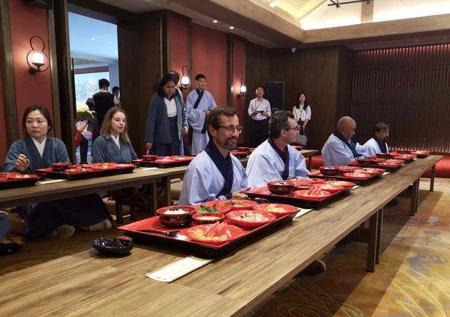 陳福、請箸、謝福、敬天地、進餐……5月17日中午,在曲阜尼山書院酒店,身著漢服的外國友人體驗了尼山食禮!耙郧笆峭ㄟ^書本了解到儒家文化,這次來山東,才真正感受到儒家文化的博大精深。”進餐時,烏茲別克斯坦記者創(chuàng)作聯(lián)合會副主席霍穆羅德·薩利莫夫拿出手機記錄了整個過程,他要帶去回給家人觀看。稍晚,外國友人來到在孔府、孔廟參觀,大家一邊聆聽講解員介紹,一邊拍照留念。
