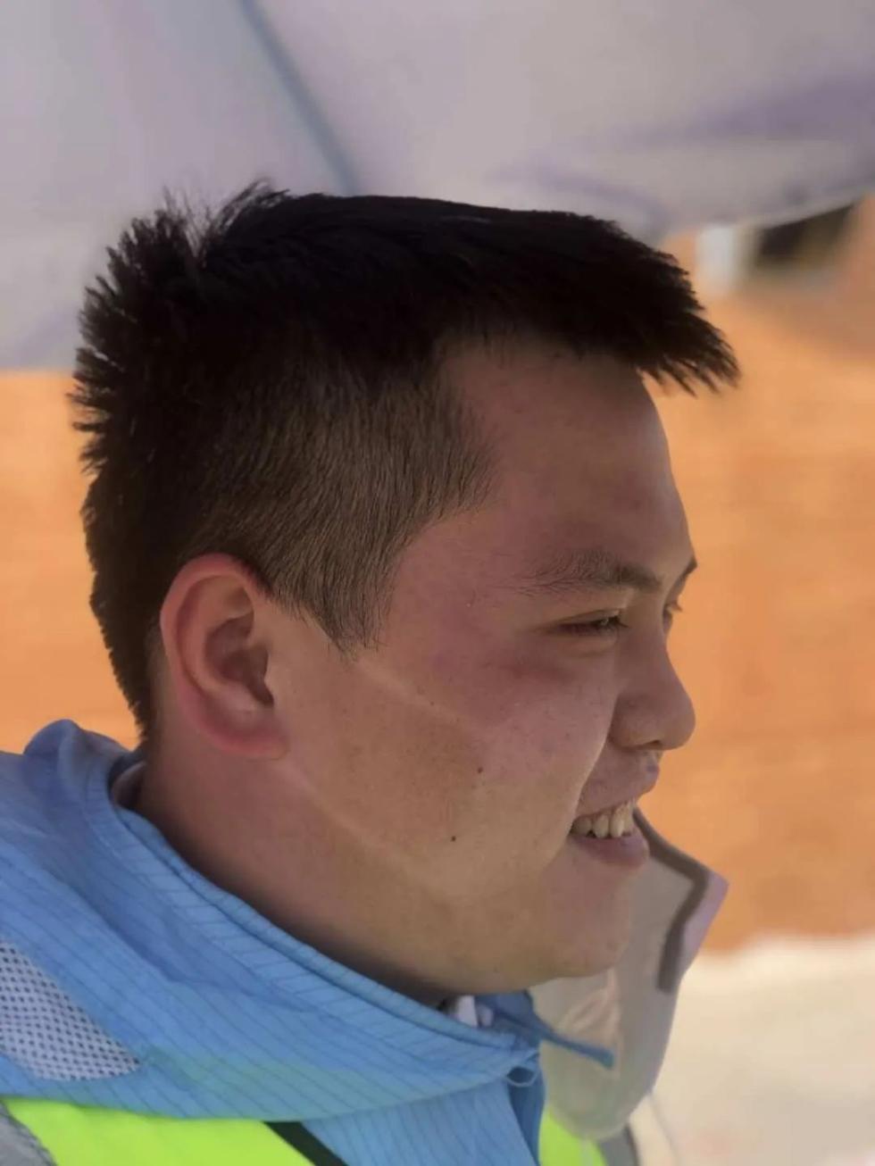 即使是站在遮陽(yáng)傘底下,戴了遮陽(yáng)帽,他的臉還是被曬傷了,留下了清晰可見(jiàn)的口罩印。疲憊的他對(duì)著鏡頭,依然露出年輕有活力的微笑。