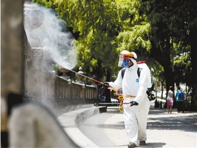 4月6日,在墨西哥首都墨西哥城,工作人員在城市主干道附近進行消殺工作。