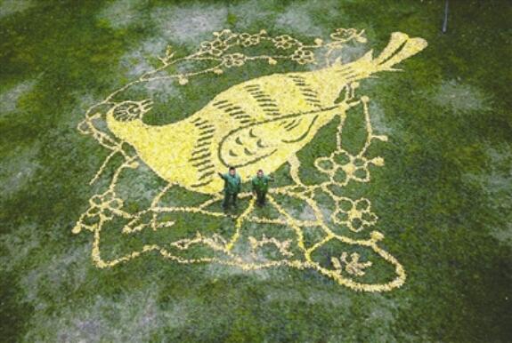 3日上午,郫都區(qū)置信逸都小區(qū)內(nèi),老何和搭檔花了近4個(gè)小時(shí)在小區(qū)中庭的大草地上“畫”出了一幅銀杏新作——臘梅花開枝頭,畫眉回眸而棲!斑要再改改,看上去全是線條!崩虾螌@幅銀杏圖不是很滿意。吃過午飯,他讓搭檔老王再去拉些銀杏葉來,“把畫眉用葉子填滿,把線條用草地本身體現(xiàn),讓它更渾然一體,更有沖擊力!