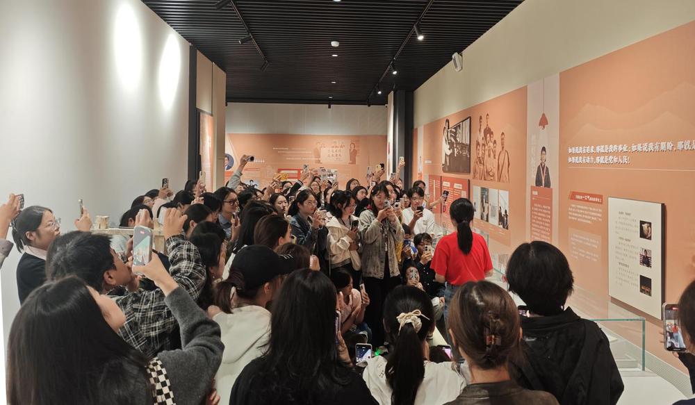 圖為于婷(右三)給2025級新生講解員做示范說明